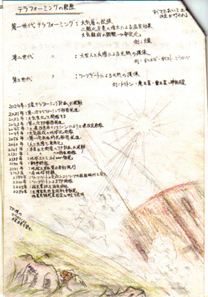 M「なんか手書きの見づらいやつが多いですね」 S「赴くままに落書きのように書いていたからな…。本当に落書きになったが」 M「あっ、紫ちゃんだ」S「セレンや紫、艦長、雅人などの設定はかなり初期の頃からあったな〜」 M「でも当時は名前はなかったんでしょ?」 S「そう。本編に登場する人物で私が付けた名前は紫とさっきの歴史上の人物二人ぐらいかな?セレンは脚本家と一緒につけたし、後のは彼の独断(怒)」 M「じゃぁ、雅人って言うのも脚本家の命名なんですね」 S「そういうこと」 M「あらかじめ総指揮が考えていたキャラって言うのは他には誰なんですか?」 S「第一回総会時までに考えていたのはさっきの連中とマオ、マドさんぐらいかな?後の連中は役職的にはあげていたけど正確などはいっさい考えていなかったし」 M「ベルダンディの人間は完全に脚本家のオリジナルなんですよね?」 S「そうそう。おかげで完成された設定に無理なくベルダンディを組み込むのが大変だったよ」 M「比較的、脚本家はノリで出してきますから…」 S「ご都合主義的なところを含めてな(ニヤソ)」 M「(ニヤソ)」 M「こっちのはテラフォーミングの経過ですか」 S「またこりゃ古い年表だ。タマカヅラの舞台が今よりも100年ほど前になっている頃だ」 M「2年ほど前に作った設定ですね」 S「あぁ。しかもかなり初期。でもこの頃にはすでに第三次世界大戦や全地球封鎖などの聞き慣れた歴史上の出来事が想定されていたみたいだ」M「トランスポートゲートに当たる表記もありますよ。ワープゲートってここには記述されていますね」 S「で、こっちにはメカ系のサンプルがあるな」 M「へー。あぁ、そういえばメカデザインは総指揮兼任でしたね。MooMinはモデリングとアニメーション作業という分担ですね」 S「まぁ、MooMinの仕事は洒落なく専門業だね。あんな複雑な3DCGソフトなんて使いこなせないよ、私には」 M「…あれ、メカの資料ってこれだけですか」 S「いや、もっとあるんだがどこのファイルにあるかわからなっくてさ」 M「戦艦タマカヅラはいつ戦艦タマカヅラになったんですか」 S「う〜ん、いまいちどの段階かは覚えていないな。ただ、初めっからタマカヅラではなかったな」 M「初めの段階では主人公艦はなんて言う名前だったんですか?」 S「『ソムニウム』だ」 M「ソムニウム!? あぁ、タマカヅラの正式名称である『第三世代型惑星間航行用玲瓏型ソムニウム級大型高速宇宙戦艦TAMAKAZURA』のソムニウムですか」 S「正解。意味は自分で調べて。古典SFマニアなら知っている人もいるはずだ」 M「さてそれでは、次に現在の「木星、独立。(仮)」製作委員会の役員が集う経過を伺ってみましょう」 S「えぇ!! まだ、続くの!?(ゲッソリ)」 |