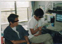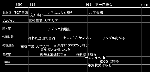 S「次に声をかけたのが脚本家だね」 M「通称『おにぃ』ですね」 S「話した切欠は機動戦艦ナデシコの映画を一緒に見に行ったときだったかな。京都の映画館の前で並んでいるときに、いろいろと」 M「当時ともなると全く今とお話が違ったんでしょうね」 S「そう。当時は人類のいなくなった地球を奪還するみたいな感じだったからね」 M「結局それはネタがなくて没になったわけですね」 S「その後、彼とはしばしばタマカヅラの形作りの切欠を話していた気がする」 ![]() M「脚本家さんも同じ高校だったんですか?」 S「いや、彼は違う高校だった。間に2人ほど挟んでの知り合いなんだ。もっとも僕に近い方の知人が同じ部活だったから出会えた訳なんだけれど。そういう意味では高校…部活つながりといえる」 M「まったくそれも運がいい話ですね。それだけ離れていたのに知り合えて、しかも後日まで交友が続いていたというのも。ちなみにこの写真はプログラマと脚本家ですね。時期は1998年夏ですか」 S「で、次に作画監督さんだ」 M「しかし、次と言っても脚本家と作画監督さんはどちらが先かってのはほとんど判断できないんですよね?」 S「そう、接触した時期で言うと微妙だね。ただ。作監さんとの接触は実は違う企画からなんだ」 M「えぇっ?タマカヅラの前に何か企画があったんですか?!」 S「いや、ちょっと違うんだな。実は私が別の企画に誘われていたんだ。結局その企画は流れちゃったみたいだけれどね…」 M「で、作監さんの件は?」 S「でね、その企画の時に彼女にはすでにタマカヅラの話をしていたんだ。そして結局は流れてしまったその企画が終われば是非とも私の、つまりタマカヅラの企画に参加してほしいと言っていたわけなのさ」 M「作監さんとはその時に?」 S「いや、彼女は高校時代の2つ上の先輩だったんだ。その企画を立てた人も同じ高校の1つ上の先輩だったんでけれどね」 M「じゃぁ、また部活つながりですか」 S「う〜ん、正確にはうちの部ではなかったんだけれど、それは書類上の話だし…(笑)。とにかく、その後もいろいろ接触する機会があって、ある時サンプルに書いてもらったセレンさんの画があって『あぁ、この人しかいない』って思ったわけ(笑)」 M「セレンさんファンですしね、総指揮は。ところで、開発室の方で拝見する限り、作監さんは総指揮以上の役職をお持ちのようですが? 」 S「そう。実はいまや作監さんは作画監督という役職に収まり切らなくなっている。むしろ役名を変えるべきかも?特に『構成』に関してはものすごい能力だね。面白いし。最近は作画よりも他の役職に割く時間の方が多いぐらいかも。初めに彼女に構成能力があると知っていたら構成監督なる役職を与えて、今頃は『構監』とか呼ばれていたのかも?……いや、それは呼びにくいな…。本編では彼女の書いた脚本も何話分か使われるので当ててみてください。とりあえず作監を含め各人のその後は、また後で。さて次は経理担当と法律顧問だ」 M「今は休養されている経理担当ですが彼の誘われた経緯は?」 S「また、これもいまいちハッキリしないんだな…。時期的にも脚本と作監とかぶっているみたいだね」 M「経理担当は松ケンさんと中学時代からのお知り合いだそうですが」 S「そうみたいだね。で、高校時代にまたまた部活で私と出会ったわけ。彼がこの企画に関わることになった切欠は、どうやら松ケンが彼に、私がゲームを作る企画を打ち立てているという話をしたらしく、それで興味を持ってくれたらしい。で、後日私が改めて『経理担当』のお願いをしたいうわけ」 M「実はこのことが後々に大きな影響をもたらすことになったと聞いたんですが?」 S「そのとおり。その話は、また後で」 M「で、法律顧問は?」 S「どうやら彼も松ケンから企画の話を聞いて興味を持ってくれたらしい。時期的にも経理と同じとおもうが上述の通り正確な時期はわからない」 M「ここまでが、だいたい1998年の夏までの話ですね。さて、これで制作陣は『プログラマ』『脚本』『作画』と集まったわけですが……あれっ!? 『音楽』担当者がいませんよ!」 S「実は、その音楽担当者がネックだったわけだ」 M「では、音楽担当の方はどうしたんですか?高校の部活つながりでうまく処理できたんじゃないんですか!?」 S「残念ながら、この企画に必要な作曲能力をもった人物が周りにいなかったんだよ…」 M「じゃぁ、どうなったんですか?」 S「ここで予定外の結果をもたらしてくれたのが経理担当だったんだ」 M「彼がですか?」 S「経理担当は私と同級生だったんだが、彼は現役で大学に入学していてね。そして彼が大学で作曲ができる人間と友達になっていてくれたんだよ」 M「それで経理担当がその友達にタマカヅラの話を持ちかけてくれたんですね」 S「そう。12月頃に私が、音楽を作れるという彼に資料を送ったわけだ」 M「そういえば1999年の年賀状はタマカヅラの企画予告でしたが、そのスタッフ欄にはまだ『